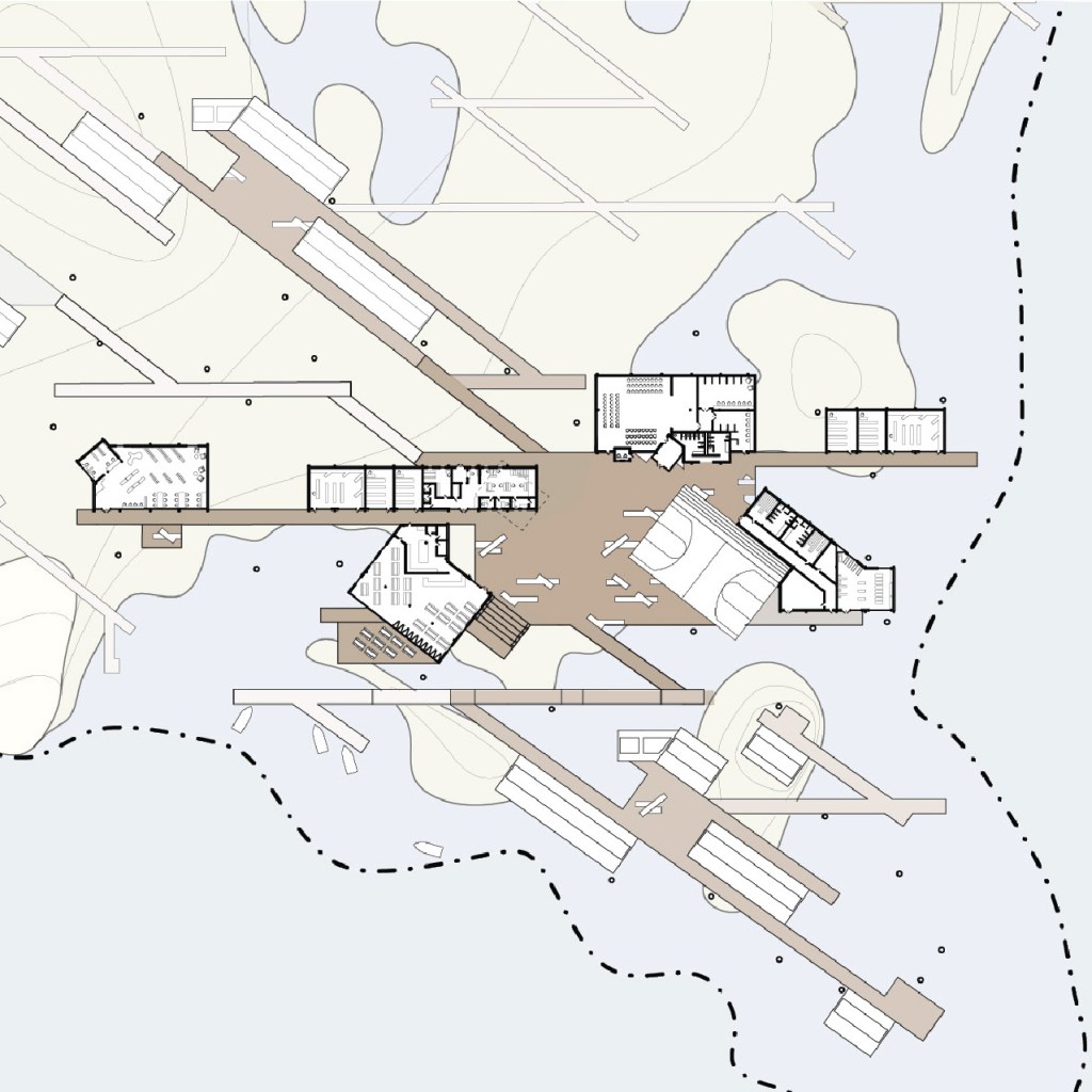 Spaces are arranged by program onto a general or ecological axis that become long platforms located on two levels to preserve views. The resulting intersection and play between volumes creates a dynamic plan that dematerializes at its edges into boardwalks.