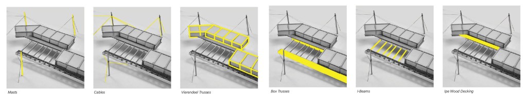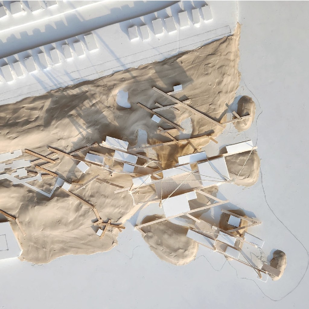 Located above a sometimes-flooded marsh, the Tuckerton High School for Environmental Studies floats above the ground on the threshold between land and water. Rejecting the idea that buildings must sit statically on the ground, it creates a new “ghost topography” on which its interior and exterior spaces sit, thus reinforcing and reproducing the horizontality of the view. Suspended on cables, the masts recall bridges and boat rigging.