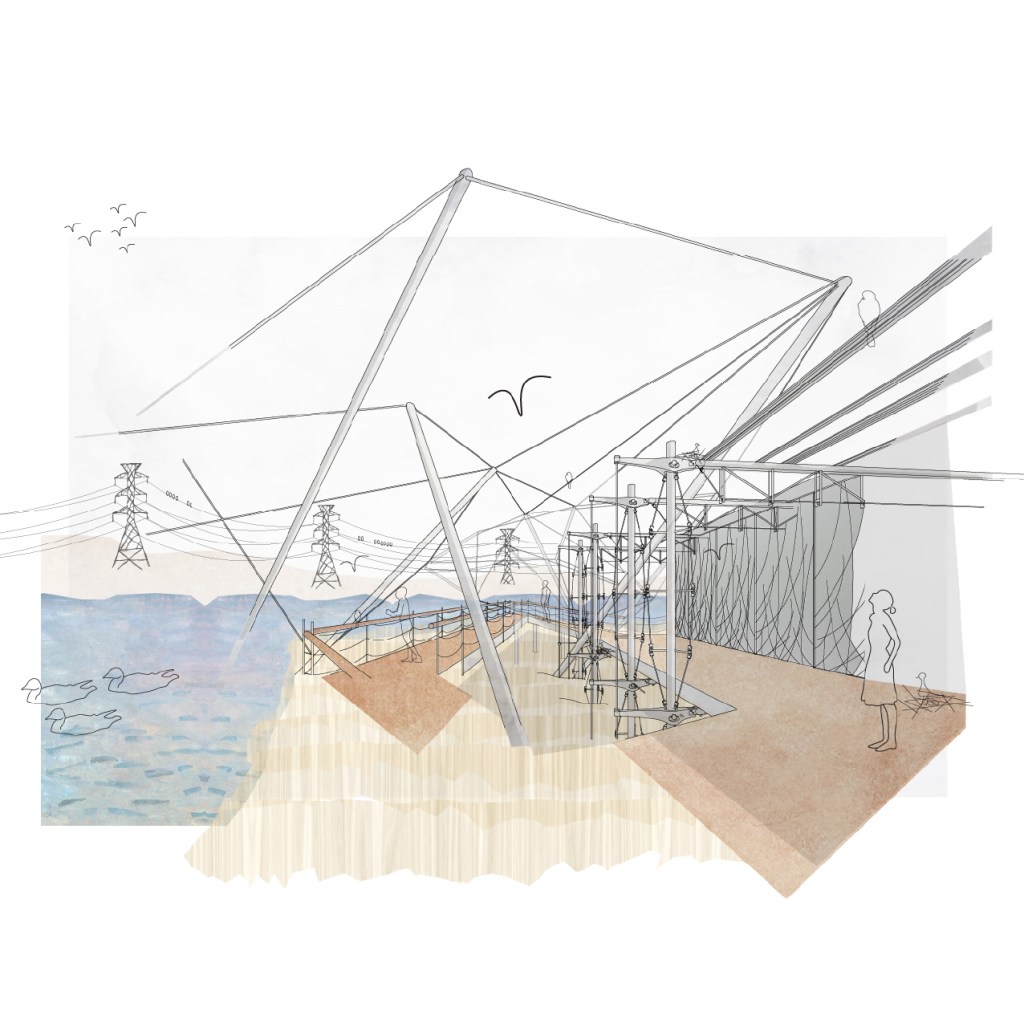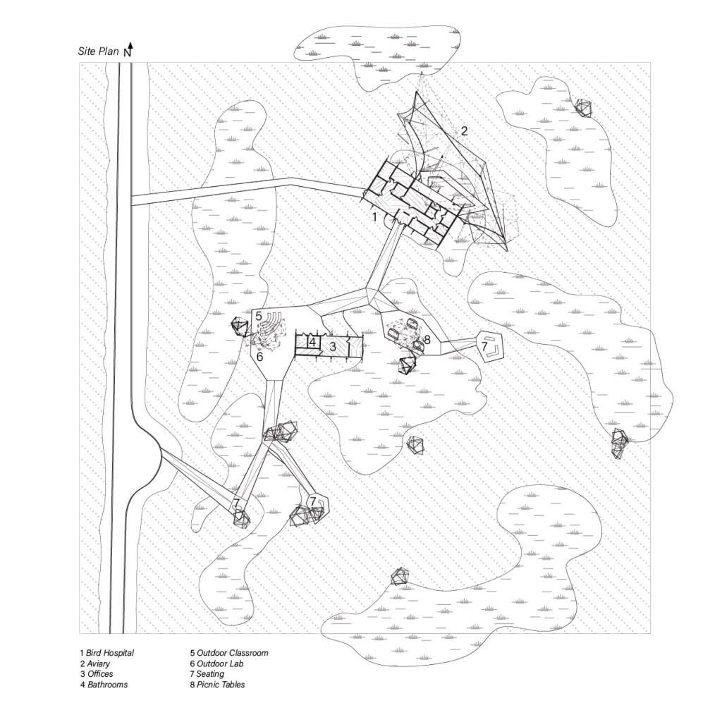 However, the reality of the Meadowlands is of wary coexistence between these forces, the product of an uneasy truce where neither has been successful in erasing the other. Appropriating the aesthetic language of the power lines, the veins that carry the lifeblood of contemporary life, with a tensegrity/gerberette structural system for a bird hospital, nesting structures, and boardwalk heightens the bizarre quality of the Meadowlands, undermines the perceived permanence of existing infrastructures, and asks whether structures for non-humans are infrastructural.