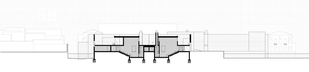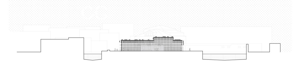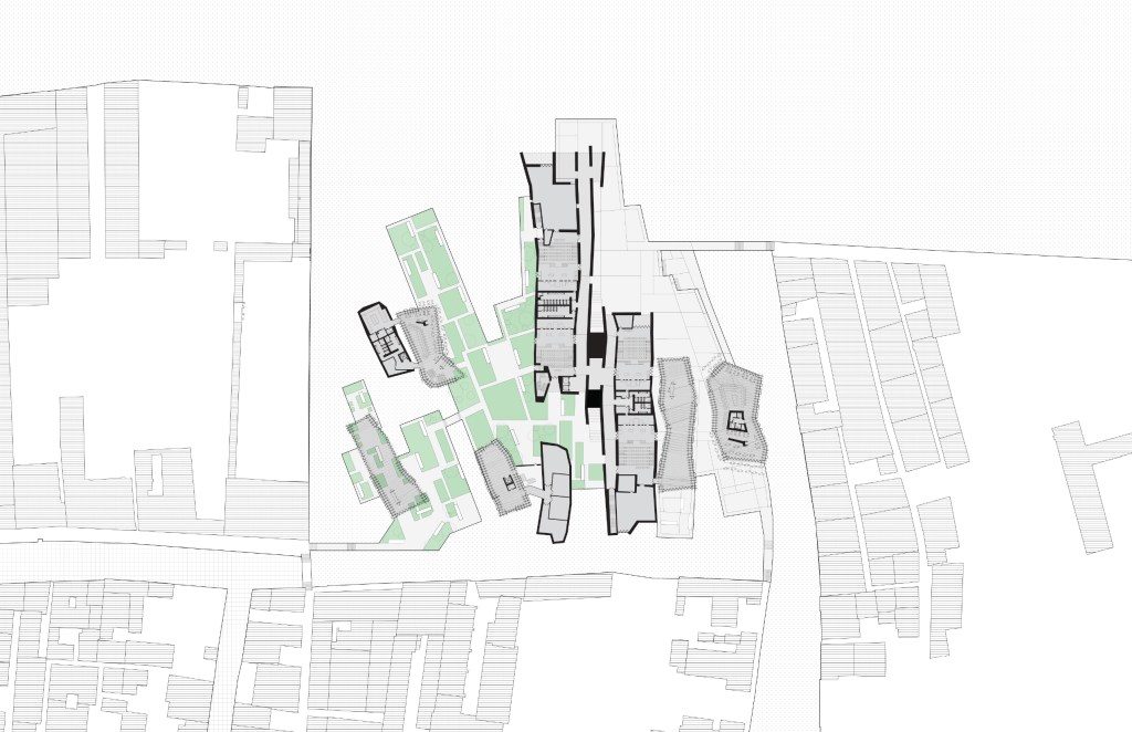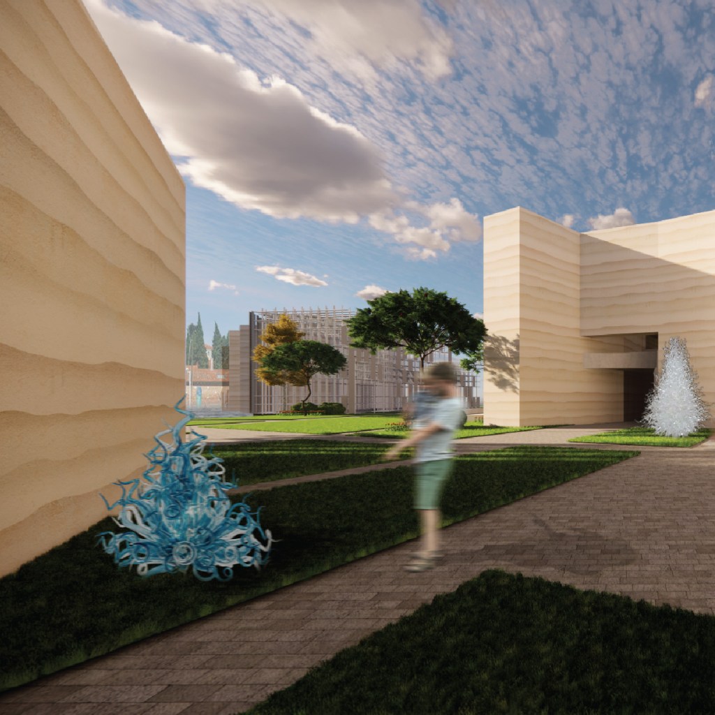 The glass production programs (the glass blowing studios and their supporting spaces) are expressed as heavy, enclosed volumes that divide the site into an urban campo to the east and gardens to the west. The social and display programs (trattoria, restaurant, and galleries), meanwhile, are light, airy, double-skinned wooden pavilions. The mass of the wall has been hollowed out with an eccentric roof enclosure mimicking the physical structure characteristic of glass, an amorphous solid that does not maintain a regular crystalline structure.